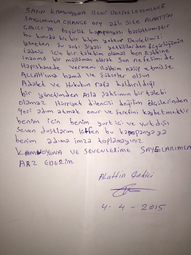 Çakıcı, mektubunda şu ifadelere yer verdi; “Beni destekleyen bir internet sitesi kurulmuş ve Alaattin Çakıcı’ya özgürlük kampanyası başlatılmıştır. Bu konuda hiçbir bilgim yoktur. Devletimizi yöneten şuan ki siyasi yetkililerden özgürlüğümün iadesi için hiçbir talebim olmaz. Ben, Rabbime inanmış bir Müslüman olarak son nefesimi hapishane de verme mi nasip etmişse Allah'a hamd ve şükürler olsun. Adalet ve hukukun rafa kaldırıldığı bir yönetimden asla şahsım olarak bir talebim olmaz. Hürriyet dilenecek değilim. Ölçülerinden geri adım atmak onur ve şerefini kaybetmektir.”