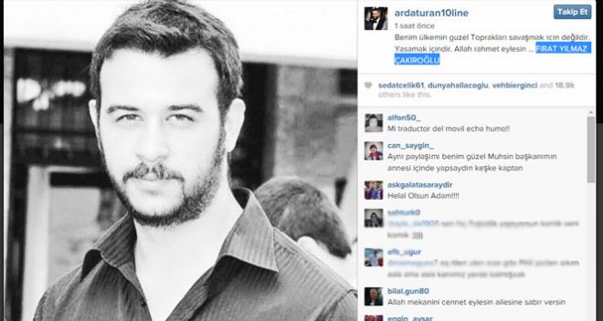 Atletico Madrid'de top koşturan ünlü futbolcu Arda Turan, üniversite öğrencisi Fırat Yılmaz Çakıroğlu'nun öldürülmesine tepki gösterdi. Ünlü futbolcu, Instagram hesabından Fırat Yılmaz Çakıroğlu'nun fotoğrafını paylaşarak, 'Benim ülkemin guzel Toprakları savaşmak ıcın değildir. Yasamak içindir. Allah rahmet eylesin ... Fırat Yılmaz Çakıroğlu' notonu düştü.