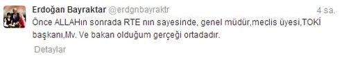 Yolsuzluk operasyonunun ardından "İstifa ediyorum" açıklamasında Başbakan Tayyip Erdoğan'a yönelik sözleri nedeniyle tepki toplayan Bayraktar, kişisel hesabından "Önce Allah'ın sonrada RTE'nin sayesinde, Genel Müdür, Meclis üyesi, TOKİ Başkanı, milletvekili ve bakan olduğum gerçeği ortadadır" ifadesini kullandı.