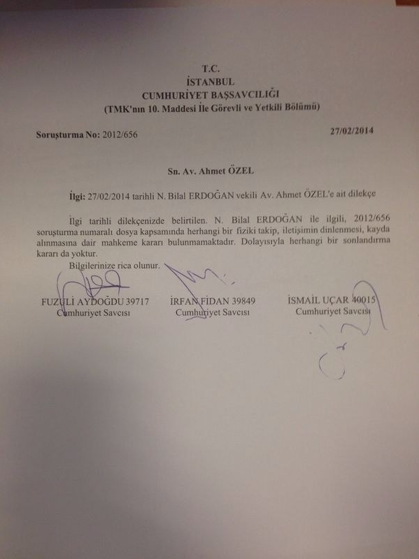 Talebi inceleyen Başsavcılık, 25 Aralık soruşturmasını yürüten Savcılar Fuzuli Aydoğdu, İrfan Fidan ve İsmail Uçar imzasıyla Avukat Ahmet Özel’e cevap yazısı verdi. Savcılığın yazısında, “Bilal Erdoğan ile ilgili 2012/656 soruşturma numaralı dosya kapsamında herhangi bir fiziki takip, iletişimin dinlenmesi, kayda alınmasına dair mahkeme kararı bulunmamaktadır. Dolayısıyla herhangi bir sonlandırma kararı da yoktur” denildi.