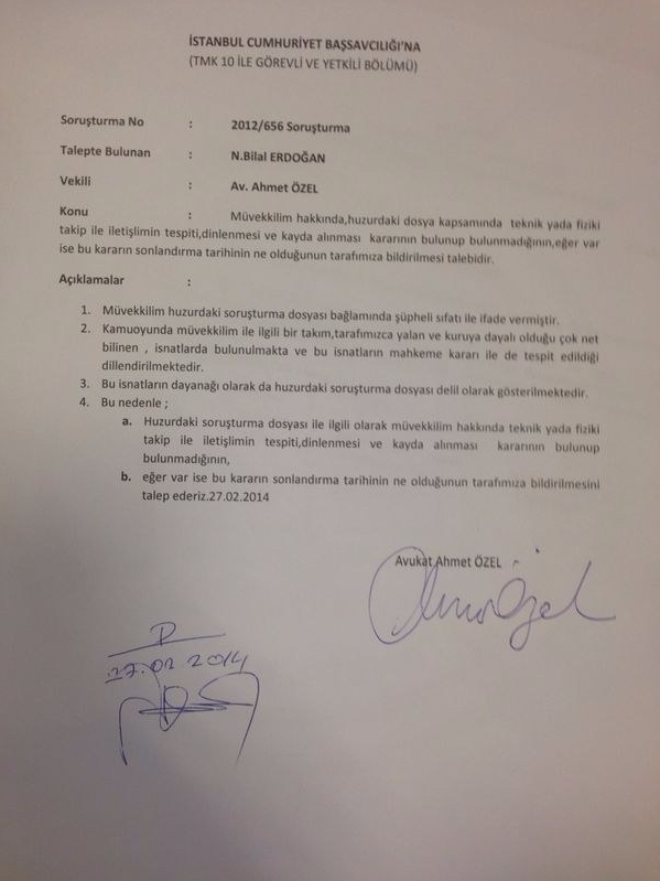 Terörle Mücadele Kanunu’nun 10. maddesiyle görevli İstanbul Cumhuriyet Savcılığı’nca yürütülen soruşturma kapsamında 5 Şubat’ta ifade veren Bilal Erdoğan’ın avukatı Ahmet Özel, İstanbul Cumhuriyet Başsavcılığı’na başvurarak müvekkili hakkında dosya kapsamında herhangi bir dinleme, fiziki takip ve iletişimin dinlenilmesiyle ilgili mahkeme kararı olup olmadığı ve böyle bir karar var ise ne zaman sonlandırıldığına ilişkin talepte bulundu.