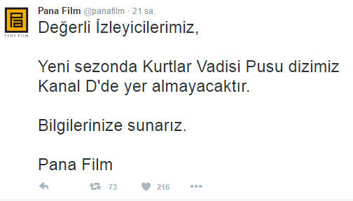 Kurtlar Vadisi Pusu dizisinin yapımcılığını üstlenen Pana Film, sosyal medya hesabından Kurtlar Vadisi Pusu'nun yeni sezonda Kanal D'de yayınlanmayacağını duyurdu.